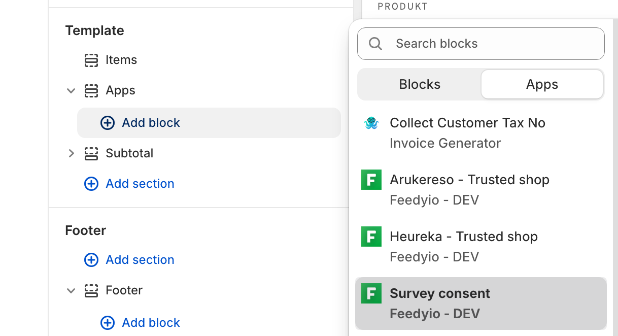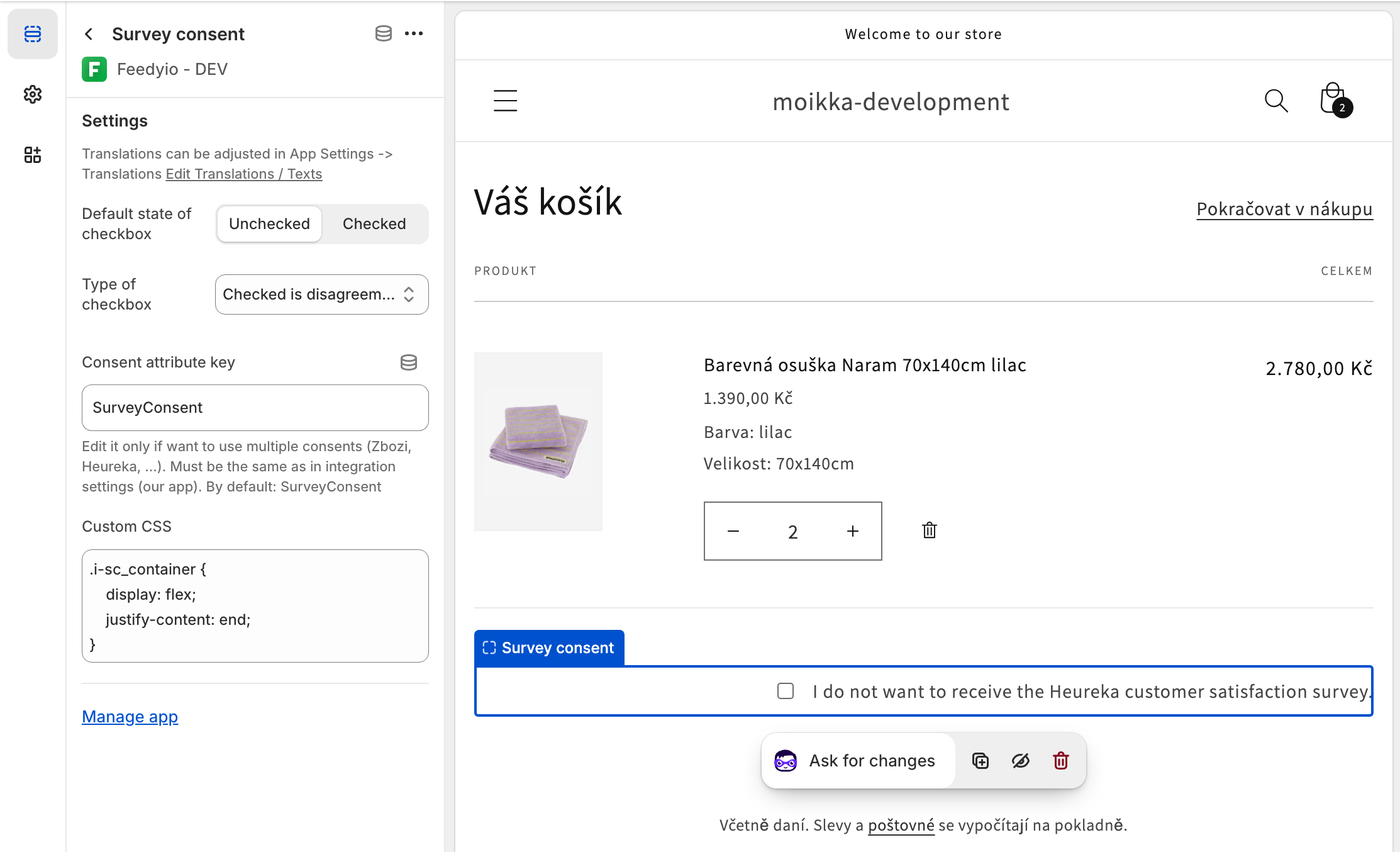The Consent Banner works with all Feedyio satisfaction survey integrations — Heureka, Zboží.cz, and Árukereső, Pazaruvaj and Compari. Feedyio app installed on your Shopify store
